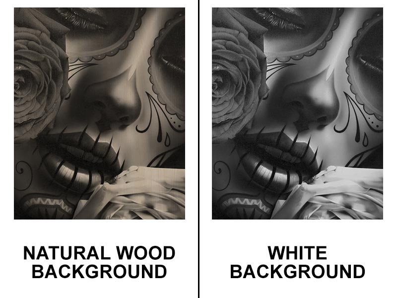 Available in either a Natural Wood background or a White background. The texture of the wood shines in the Natural Wood option, while the whites from the art are more vivid with the White option.