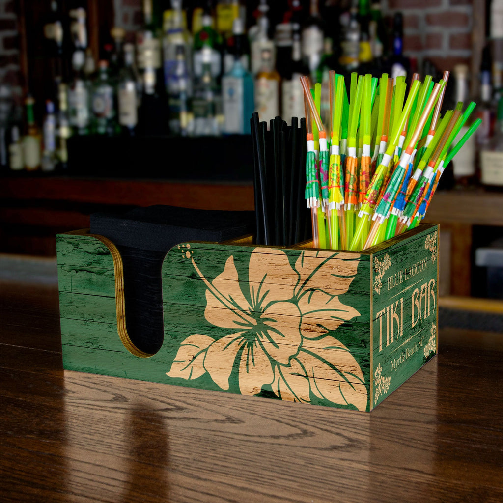 This beautifully rustic wooden Bar Top Napkin Caddy is an exceptional addition to any type of bar setting! The quality of craftsmanship (handmade in the USA) is beyond compare. Designed with 3 compartments perfect for storing your bev naps, straws, and stirrers. Durably built with a quality imprint dyed right into the wood maintains a desirable (and trendy) rustic wooden appeal.