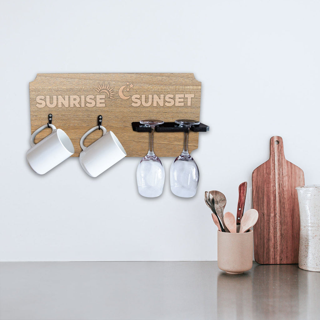 Crafted out of high-quality birch plywood, our "Sunrise, Sunset" Mug and Wine Glass Holder is a charming and humorous way to store your mugs and wine glasses, convenient and ready to help kickstart your morning or wind down your evening! This painted-wood sign rack holds 2 mugs and 2 wine glasses and comes ready to hang with hardware pre-installed.