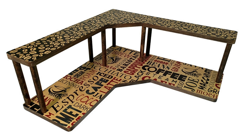 These 2-tier birch wood shelves are designed to fit perfectly in the corner, on the counter underneath your cabinets. The tall dowel rods lift the 2nd shelf up 7" above the 1st shelf, allowing the perfect amount of space on the bottom and top tiers to hold your Barista-related supplies such as mugs, sugars, creamers, and other condiments.