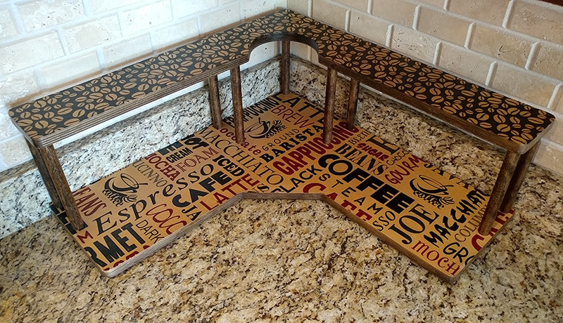 These 2-tier birch wood shelves are designed to fit perfectly in the corner, on the counter underneath your cabinets. The tall dowel rods lift the 2nd shelf up 7" above the 1st shelf, allowing the perfect amount of space on the bottom and top tiers to hold your Barista-related supplies such as mugs, sugars, creamers, and other condiments.