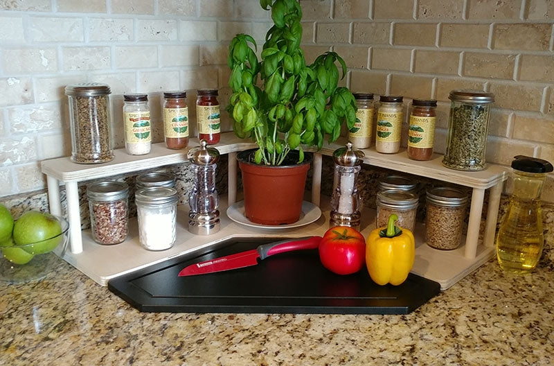 These 2 tier shelves are designed to fit perfectly in the corner underneath your cabinets, while still being able to easily access common spices and other ingredients. They are handcrafted in the USA, right here in our very own BPC woodshop. Counter Caddy Corner Shelves are constructed from a durable wood material with 9 secure 5.75"H dowel rods. This particular shelf features a smooth natural finish that allows you to keep that natural look OR apply a stain/paint that perfectly matches your kitchen theme! They are also sold with rubber feet on the bottom, giving the shelf a bit of a raise from your counter while protecting it from scratches and bacteria build up.