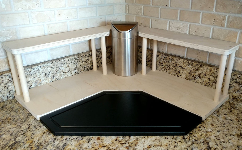 These 2 tier shelves are designed to fit perfectly in the corner, on the counter underneath your cabinets. The 7.5" tall dowel rods lift the 2nd tier up, allowing the perfect amount of space on the bottom tier to hold your Barista related supplies such as sugars, creamers and other condiments. The top tier features a half circle cutout that you can conveniently slide up to a 4.5" diameter trash can into.