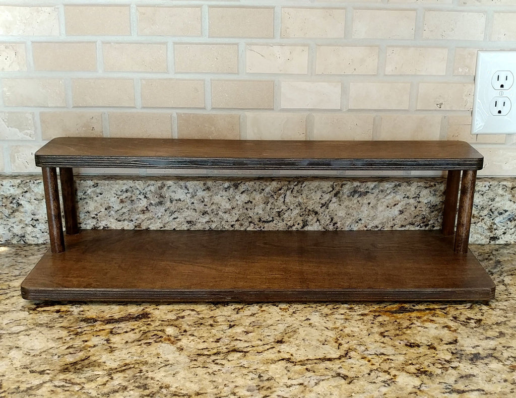 These 2-tier shelves are designed to fit perfectly underneath your kitchen cabinets, while still being able to easily access common spices and ingredients. They are handcrafted in the USA, right here in our very own BPC woodshop. Our counter caddy shelves are constructed from durable baltic birch wood, with 4 secure 5.75"H dowel rods. The stained finish is easy to clean and each shelf is sold with rubber feet on the bottom, giving the bottom shelf a bit of space from your counter to help protect it from scratches and bacteria build-up.