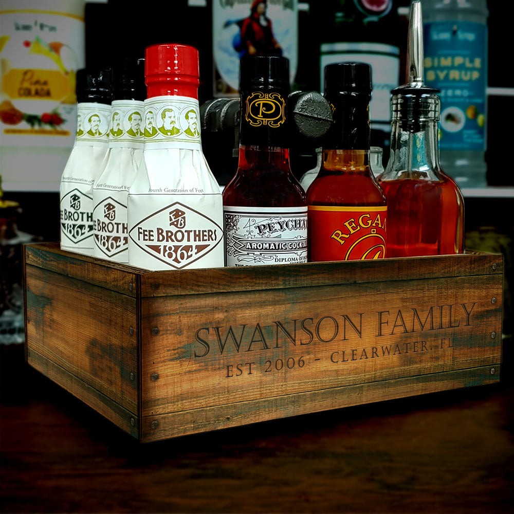 These industrial box caddies are a unique way to tote and store some of your favorite condiments and ingredients. Handcrafted from a quality birch wood and then customized with a customizable Vintage Box design, this caddy will look awesome sitting on any bar top, table top or even kitchen counter top. The industrial metal pipe handle adds to its flare taking your typical bar caddy to a creatively innovative level. You are sure to love the quality and design of this caddy box.