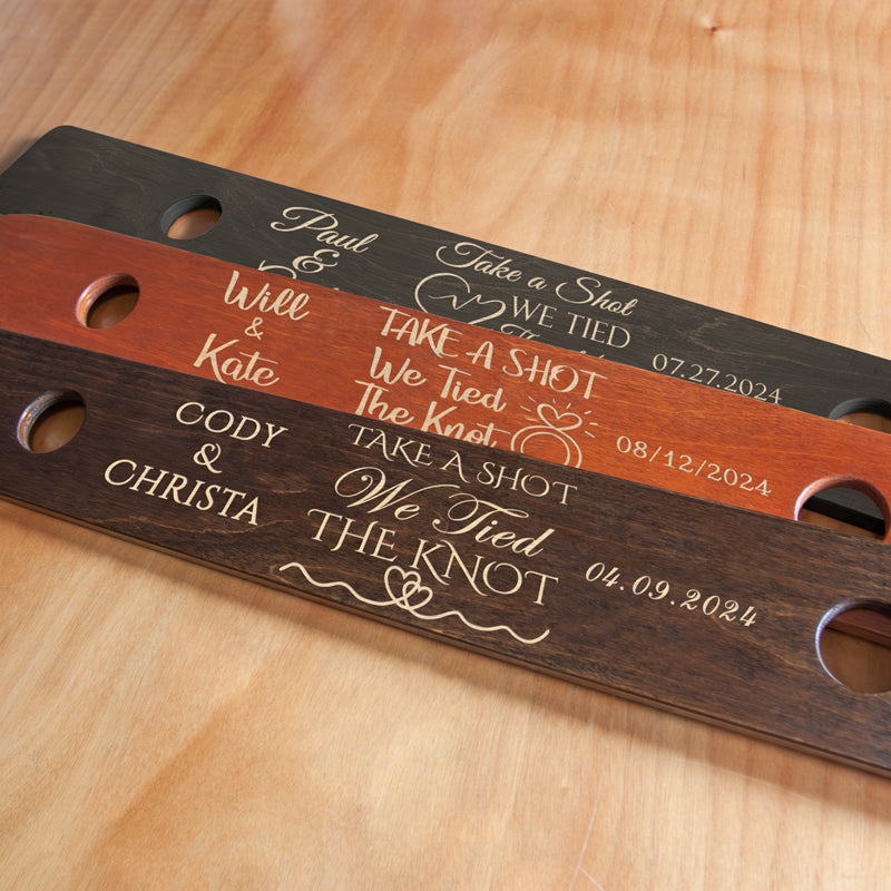 Get ready to shred the slopes and shots with our 2-Person Wood Shot Ski! Handmade in our in-house woodshop, choose from 3 stains and 6 custom designs, all expertly laser engraved for maximum style. Get ready to take your party to the next level with our custom laser-engraved shot ski design! Perfect for any gathering, this one-of-a-kind shot ski adds a personalized touch to any drinking game. Cheers to good times and unique memories with our laser-engraved shot ski!
