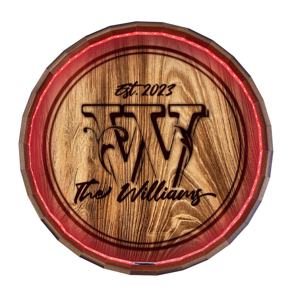 This handcrafted LED barrel-top wooden sign will blend perfectly with any environment. The vintage look of this wall art is reminiscent of used wine and whiskey barrels. Each sign is uniquely handcrafted in our wood shop by our skilled artisans. The character of naturally aged wood makes this an instant classic that will never go out of style, while the authentic look and feel add a historical aspect to any home or establishment. A great element of this wine barrel sign is the light color of the wood which gives it a clean and classic look. Add the year, your family name, and the first letter of your family, and watch it transform into a precious heirloom to be treasured for years to come.