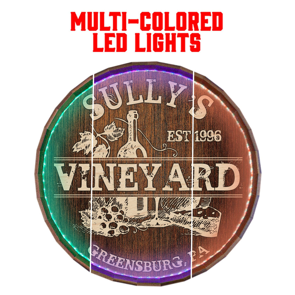 This handcrafted LED wine barrel top wooden sign blends in perfectly with any environment. The vintage look of this wall art is reminiscent of used wine and whiskey barrels. Each sign is uniquely handcrafted in our wood shop by our skilled artisans. The character of this piece is created by the look of the naturally aged wood, making it an instant classic that will never go out of style, while the authentic look and feel of this piece add a historical element to any home or establishment. Add a name, date, and city to customize and watch this Vineyard-themed sign transform into a personal and unique piece of art. The image depicts a classy and sophisticated look, making it perfect for any wine aficionado. This handcrafted barrel top sign is a beautifully sentimental piece and the perfect touch to any loving environment.
