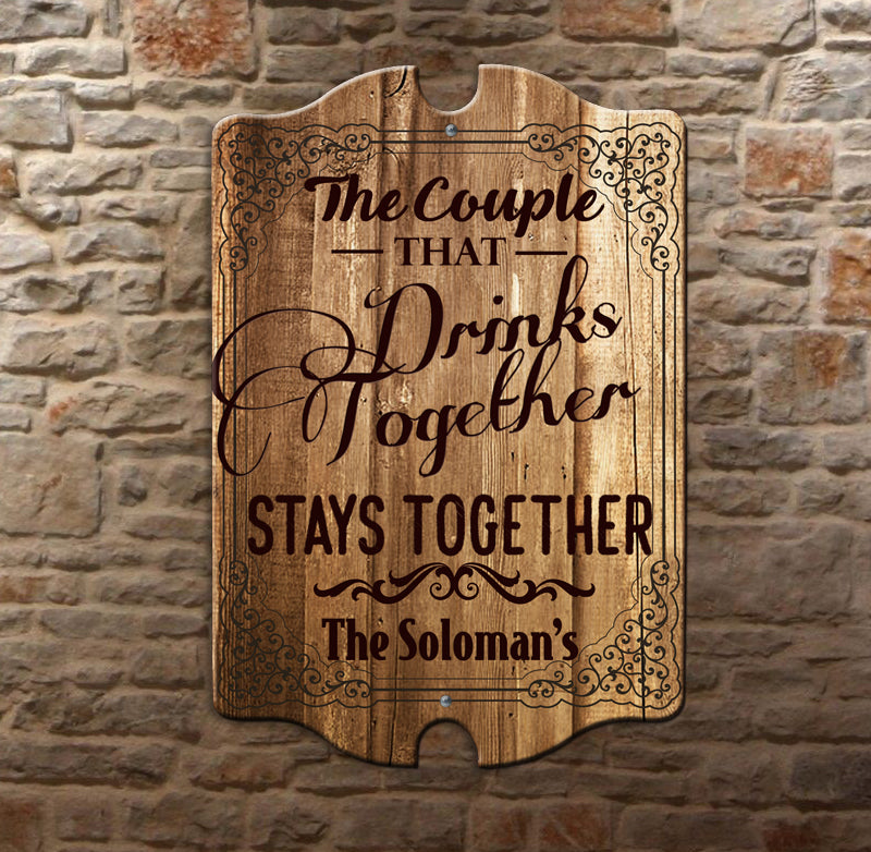 A couple that drinks together, stays together! If you know how to have a good time with your significant other, then this sign is perfect for your home! This wood tavern sign features a classic look that is always in style and looks great anywhere. Personalize it with your family name or anything you would like. It is made of real wood, and has 2 holes that have been drilled to allow for easy hanging on any wall. This sign also makes a great holiday or house-warming present!