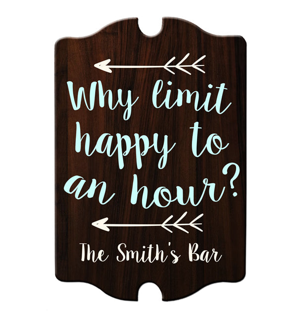Seriously...why limit happy to an hour? This wood tavern sign features a classic look with a fun modern font that will surely look great hung anywhere. Personalize it with your bar name, family name, or any text you would like. It is made of real wood, and has 2 holes that have been drilled to allow for easy hanging on any wall. This sign also makes a great holiday or house-warming present!