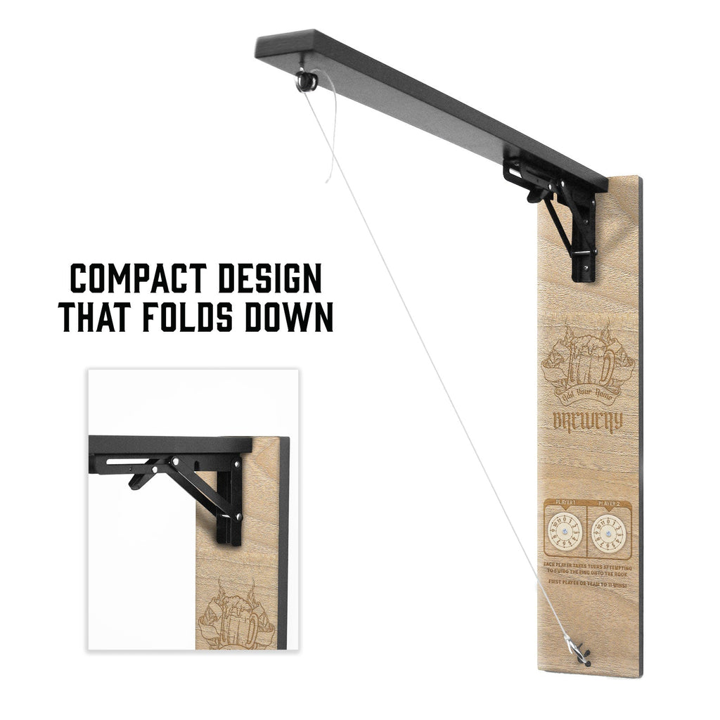 Introducing our Wall Mounted Folding Ring Toss Game! This game is the perfect addition to your outdoor BBQs and patio cocktail parties. Fun for all ages, as kids love a challenging game of ring toss as much as adults. Not only is this mountable ring toss game fun, but it also looks great showcasing a custom engraved Brewery Beer Mug design. It features a steel hinge with a smooth black finish. Handcrafted in our own USA-based Bar Products Wood Shop, you are sure to be pleased with its construction, durability, and quality. Customizable name option available.