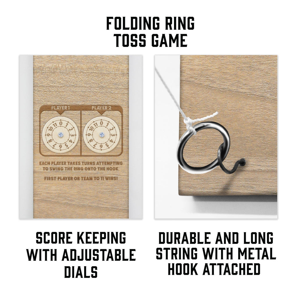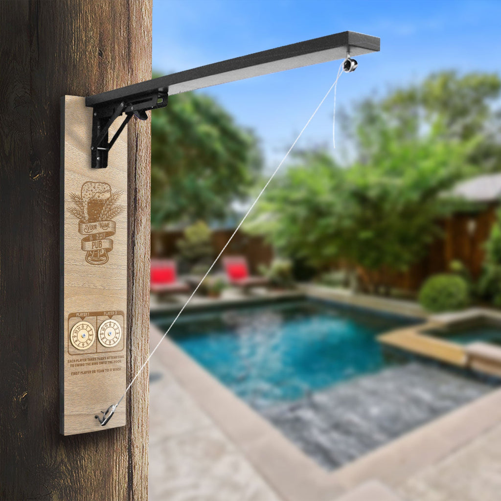 Introducing our Wall Mounted Folding Ring Toss Game! This game is the perfect addition to your outdoor BBQs and patio cocktail parties. Fun for all ages, as kids love a challenging game of ring toss as much as adults. Not only is this mountable ring toss game fun, but it also looks great showcasing a custom engraved Pub Beer Pint design. It features a steel hinge with a smooth black finish. Handcrafted in our own USA-based Bar Products Wood Shop, you are sure to be pleased with its construction, durability, and quality. Customizable name option available.