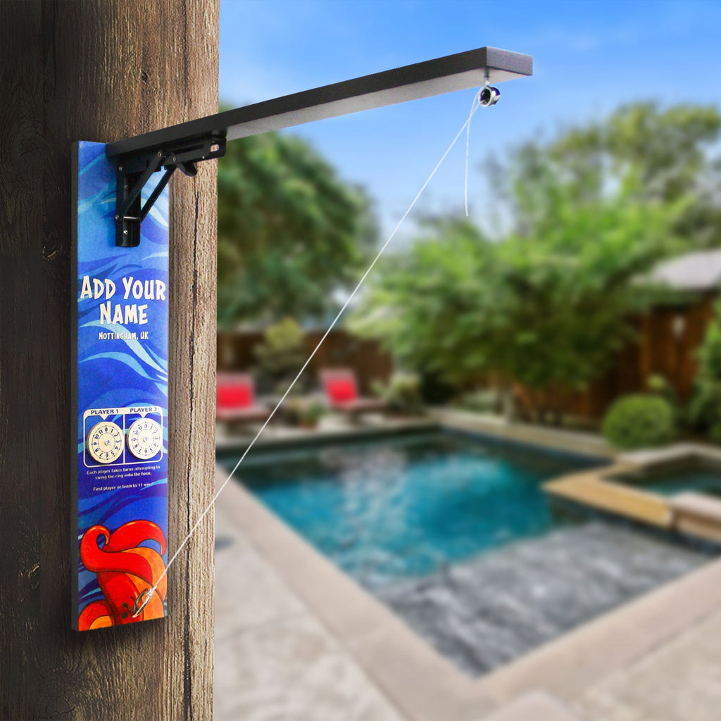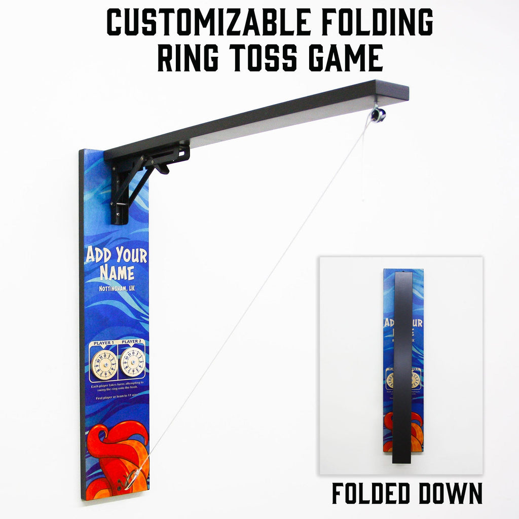 Introducing our Wall Mounted Folding Ring Toss Game! This game is the perfect addition to your outdoor BBQs and patio cocktail parties. Fun for all ages, as kids love a challenging game of ring toss as much as adults. Not only is this mountable ring toss game fun, but it also looks great showcasing an eccentric octopus design. It features a steel hinge with a smooth black finish. Handcrafted in our own USA-based Bar Products Wood Shop, you are sure to be pleased with its construction, durability, and quality. Customizable name option available.