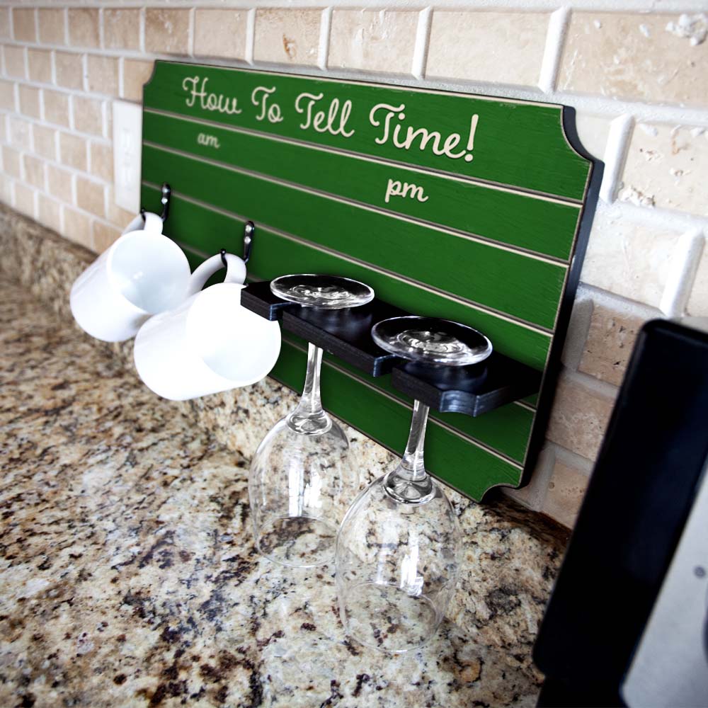 Crafted out of high-quality birch plywood, our “How To Tell Time” Mug and Wine Glass Holder is a charming and humorous way to store your mugs and wine glasses, convenient and ready to help kickstart your morning or wind down your evening! This painted look wood sign rack comes in multiple color options and holds 2 mugs and 2 wine glasses and comes ready to hang with hardware pre-installed.