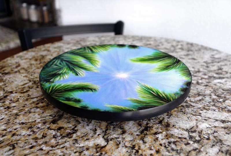 These beautiful Lazy Susans are 3/4" thick, and come in three different sizes, 12", 16", and 24", meaning there's a size available for any table or counter space. The round base is sturdy, and the spinning mechanism is well-built and allows for smooth, easy spinning, and features 4 rubber stoppers that protect your tabletop from wood scraping. The Lazy Susan is wrapped with rubber black T-molding that protects the side of the all-natural wood top.