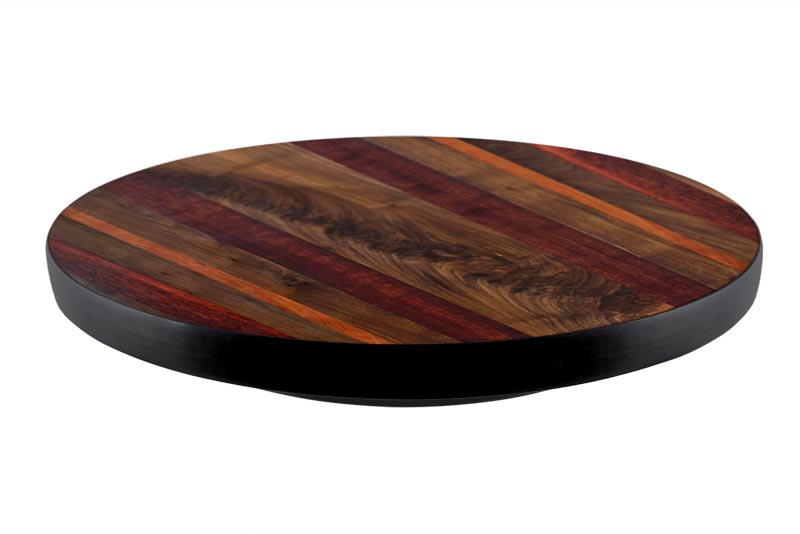 These beautiful Lazy Susans are 3/4" thick, and come in three different sizes, 12", 16", and 24", meaning there's a size available for any table or counter space. The round base is sturdy, and the spinning mechanism is well-built and allows for smooth, easy spinning, and featured 4 rubber stoppers that protect your table top from wood scraping. The Lazy Susan is wrapped with rubber black T-molding that protects the side of the all-natural wood top.