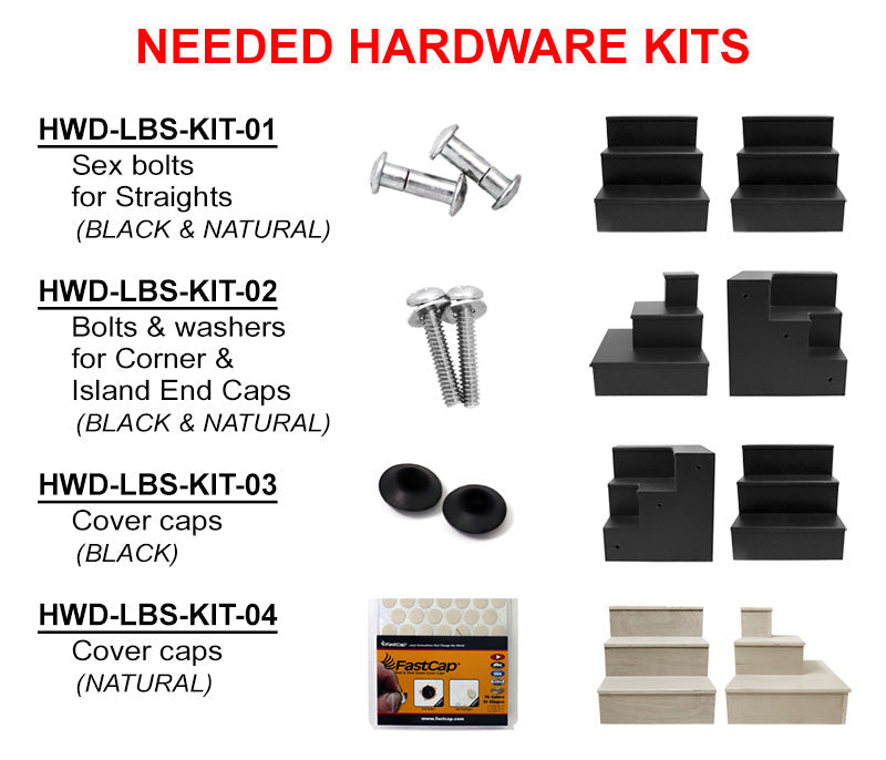 - For Corners and Island End Caps, you'll need two sets of Bolts & Washers (HWD-LBS-KIT-02).