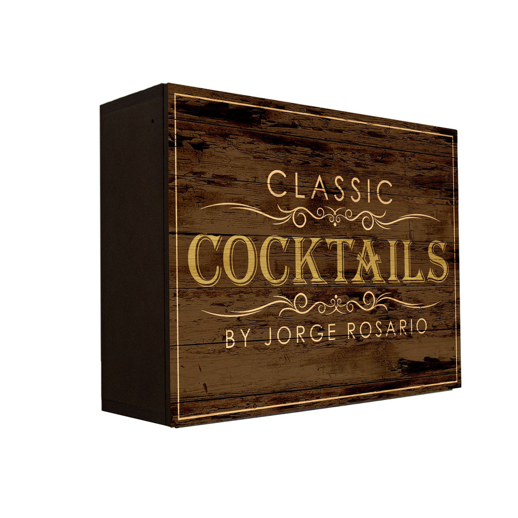 The Murphy WalBAR™ is custom-built in our USA-based woodshop. It has been meticulously designed in favor of the home bar enthusiast. Measuring 18"H x 24"W x 7.5"D it securely attaches to your wall space with a French Cleat (included). When not in use, the bar can remain latched and closed to showcase a customizable design such as this Classic Cocktail theme design. All you need to do is type in your text with your personal information and you have yourself this gorgeous signature piece. The unprinted sides, top, bottom, and inside are finished with a beautiful dark walnut stain.
