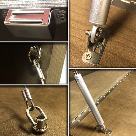 When you are ready to use your bar, simply unlatch and open the door to create a bar top area. It is designed with a stainless steel gas shock, allowing for smooth resistance when opening. But wait! The best part is the contents inside your Murphy WalBAR™! Featuring 3 compartments inside, you'll find it the perfect space to store several of your favorite spirits, glassware of choice as well as your bartending tools! The right compartment of the bar measures 10" in width and features an adjustable 4-pin shelf with a total of 9 adjustable options. See below for more construction features.