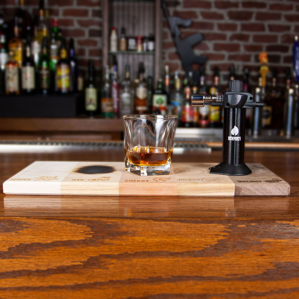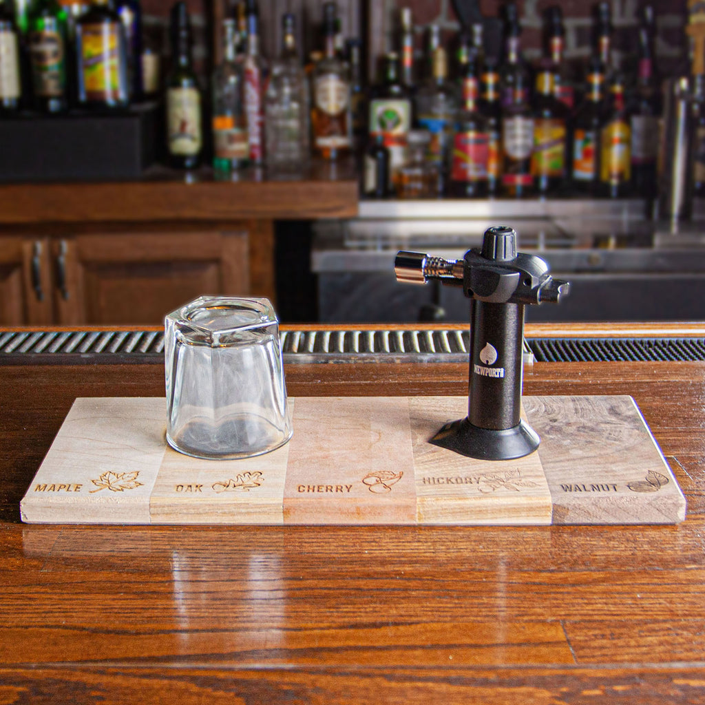 Intensify your cocktails with our new Smoking Sampler Board! Our Smoker Sampler Board allows you to add flavors and the aroma of smoked wood to your favorite craft cocktails! It is the perfect gift for those with a personal bar or use it in a professional bar setting! It comes in 5 flavors: Maple, Oak, Cherry, Hickory, and Walnut. Each wood slab adds subtle smoky notes and earthy tones to assure delight to your drinks from the first sip! Just burn the board with the butane torch included, and cover it with a glass to trap the aroma and flavors in the glass. Boards can be burnt many times before they lose their aroma.