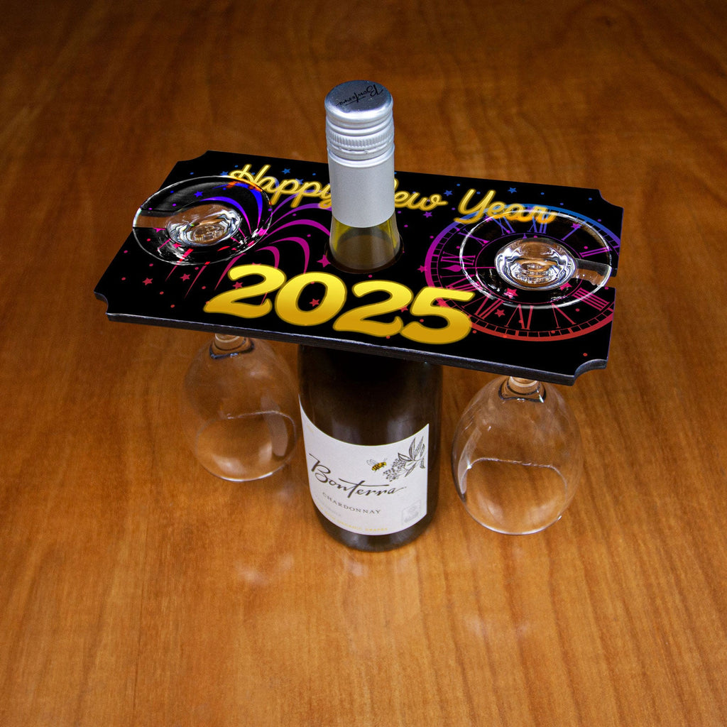 This fun wooden 2025 New Year's Eve is an exceptional addition to any type of bar or home setting! Our Wine Glass Caddy makes for a wonderful Housewarming gift and a unique Holiday gift for the kitchen. The quality of craftsmanship (handmade in our Woodshop USA) is beyond compare. This caddy allows you to carry 2 glasses of wine and a bottle of wine all in one hand. It also can be stacked with another caddy to hold 4 glasses! It also comes with 2 of our BARCONIC® 12 OZ WINE GLASSES!