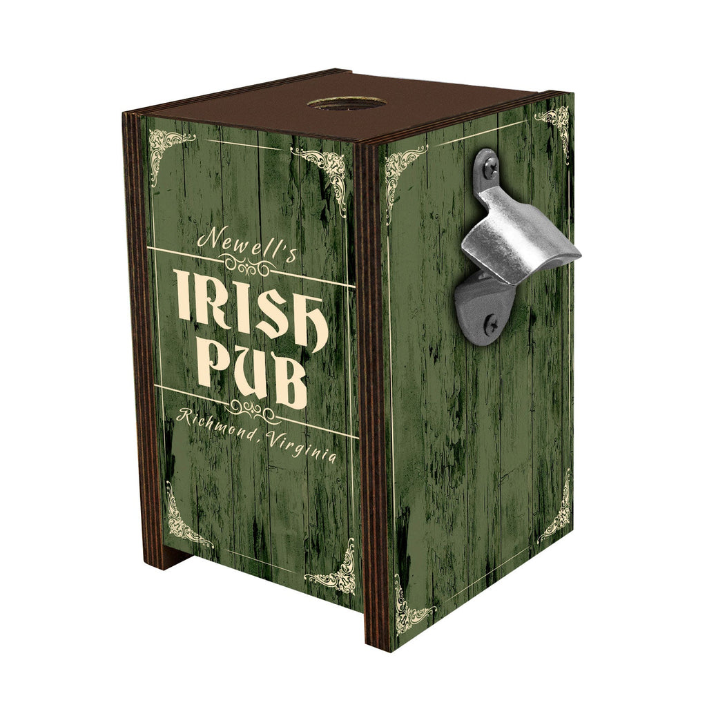 Wooden Bottle Cap Holder Box with Metal Bottle Opener - Walnut Stain - Custom Irish Pub Design