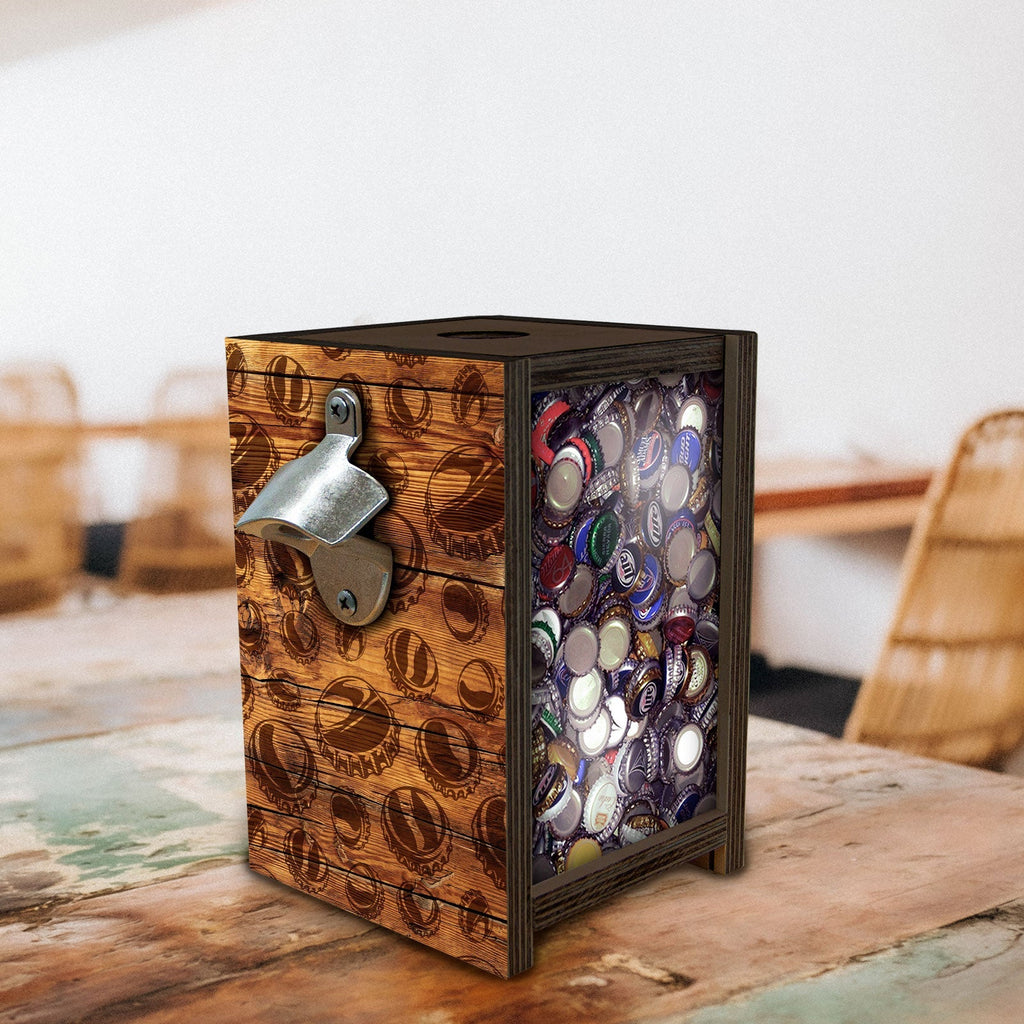 This wooden bottle cap holder box features a metal bottle opener and a clear front, perfect for showcasing bottle caps or small items such as cash or change. The rustic bottle cap design and walnut-stained finish add an exquisite touch of style and sophistication. Ideal for lovers of beer and style alike.
