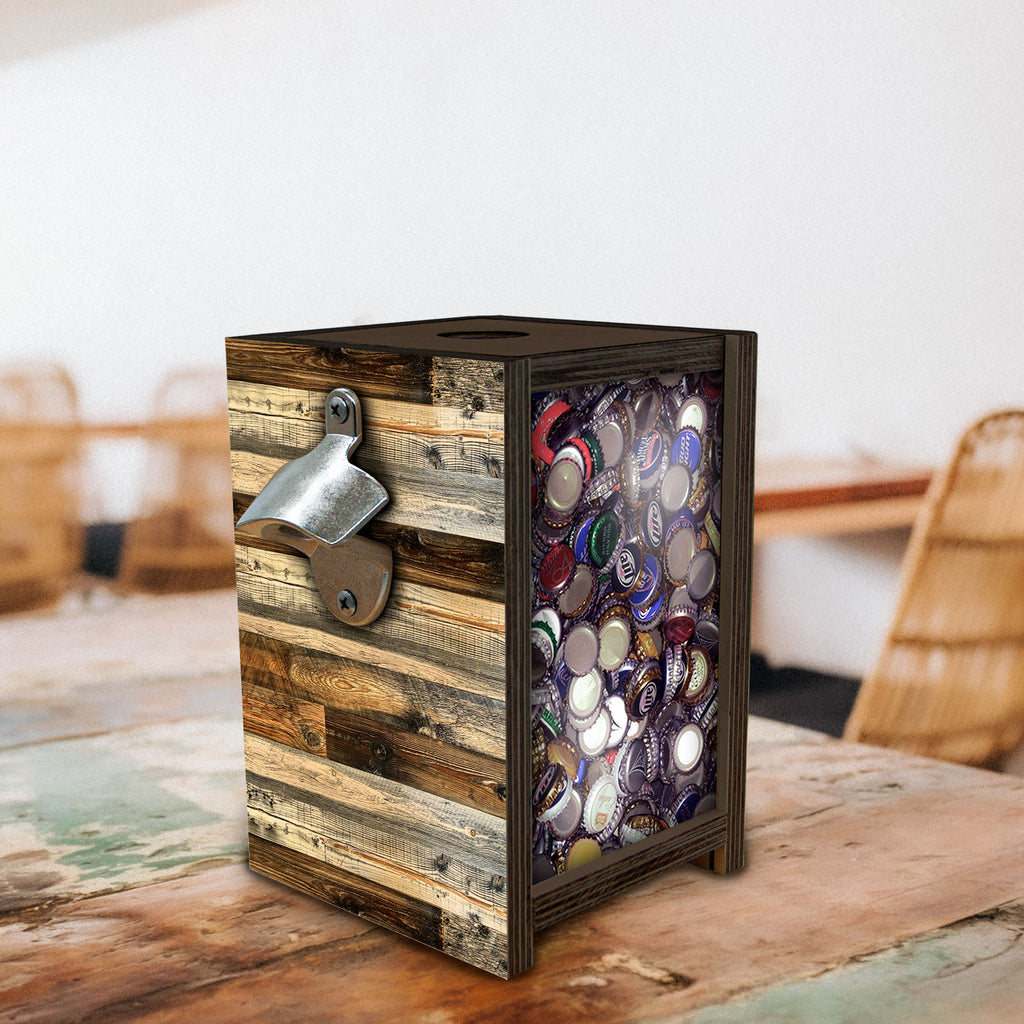 This wooden bottle cap holder box features a metal bottle opener and a clear front, perfect for showcasing bottle caps or small items such as cash or change. The rustic bottle cap design and walnut-stained finish add an exquisite touch of style and sophistication. Ideal for lovers of beer and style alike.