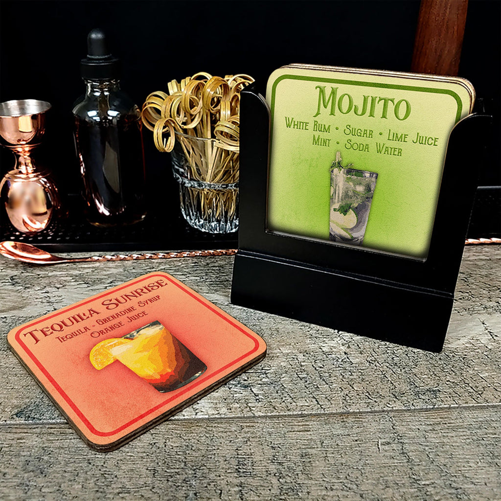 Lift your spirits and drinks with these stylish cocktail coasters! Perfect for when you're entertaining, the set of four comes with a fun and trendy design of four classic cocktails. Sold in packs of 4 with a black wooden coaster caddy. The ultimate companion for showing off your bartending skills and creating a unique home bar setup.