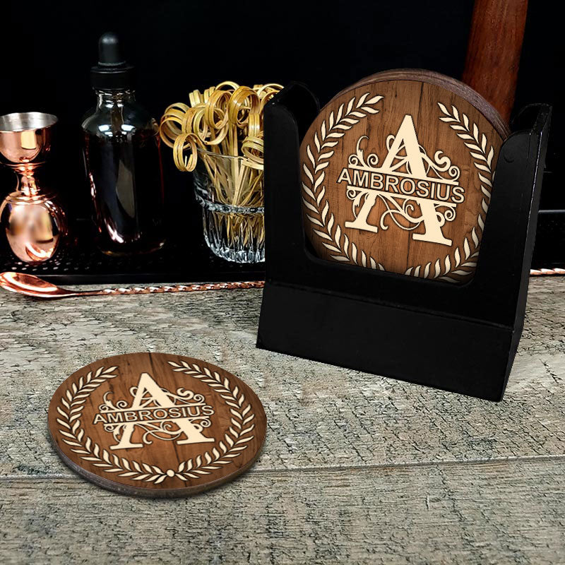 Looking for a non-disposable coaster solution that will look phenomenal displayed on your bar or table tops? How about one that is easily customizable and showcases a trendy "Dark Wood With Leaves" design theme? These custom wood coasters are just what you've been looking for! Handcrafted in the USA, these high-quality coasters allow for full-color design while featuring a rustic wood element. Very easy to customize, simply type in your text and we do the rest! These coasters also make for a great gift idea! 4-inch round shape. Sold in packs of 4 with a wooden coaster caddy add-on option. We recommend pairing it with our Custom Dark Wood With Leaves Design!