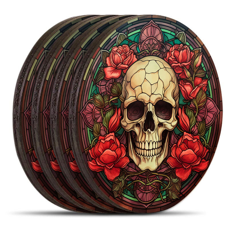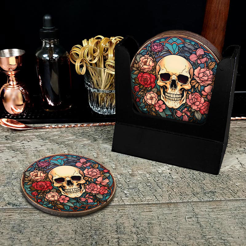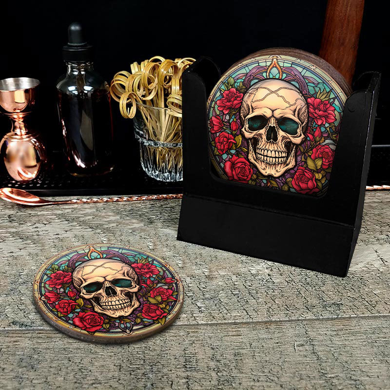 Looking for a non-disposable coaster solution that will look phenomenal displayed on your bar or table tops? How about one that has a colorful and trendy "Stained Glass Skull" design theme? These wood coasters are just what you've been looking for! Handcrafted in the USA, these high-quality coasters allow for full-color design while featuring a rustic wood element. These coasters also make for a great gift idea! 4-inch round shape. Sold in packs of 4 with a wooden coaster caddy add-on option.